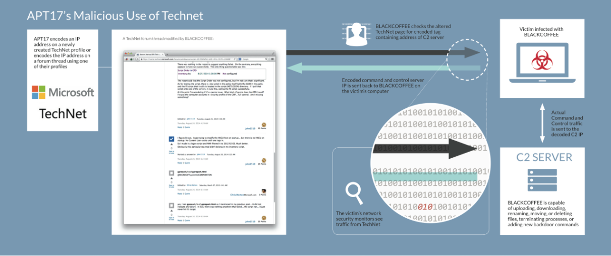Attack vectors: The threat group took advantage of the ability to create profiles and post in forums to embed encoded CnC for use with a variant of the malware it used. This technique can make it difficult for network security professionals to determine the true location of the CnC, and allow the CnC infrastructure to remain active for a longer period.