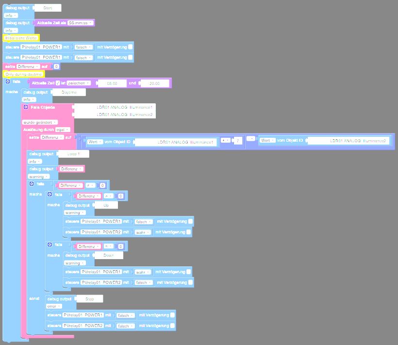console.log('Start');console.log(formatDate(new Date(), 'hh:mm:ss'));// Initialisiere WertesetState('sonoff.0.PVrelay01.POWER1' /* PVrelay01 POWER1 */, false);setState('sonoff.0.PVrelay01.POWER1' /* PVrelay01 POWER1 */, false);Differenz = 0;// Only during daytimeif (compareTime('08:00', '20:00', 'between', null)) { console.log('Daytime'); on({ id: [].concat(['sonoff.0.LDR01.ANALOG_Illuminance1']).concat(['sonoff.0.LDR01.ANALOG_Illuminance2']), change: 'ne' }, async (obj) => { Differenz = (getState('sonoff.0.LDR01.ANALOG_Illuminance1').val + 7) - getState('sonoff.0.LDR01.ANALOG_Illuminance2').val; console.log('Loop 1'); console.warn(Differenz); if (Differenz != 0) { if (Differenz > 0) { console.warn('Up'); setState('sonoff.0.PVrelay01.POWER1' /* PVrelay01 POWER1 */, false); setState('sonoff.0.PVrelay01.POWER2' /* PVrelay01 POWER2 */, true); } if (Differenz < 0) { console.warn('Down'); setState('sonoff.0.PVrelay01.POWER1' /* PVrelay01 POWER1 */, true); setState('sonoff.0.PVrelay01.POWER2' /* PVrelay01 POWER2 */, false); } } else { console.error('Stop'); setState('sonoff.0.PVrelay01.POWER1' /* PVrelay01 POWER1 */, false); setState('sonoff.0.PVrelay01.POWER2' /* PVrelay01 POWER2 */, false); } });}